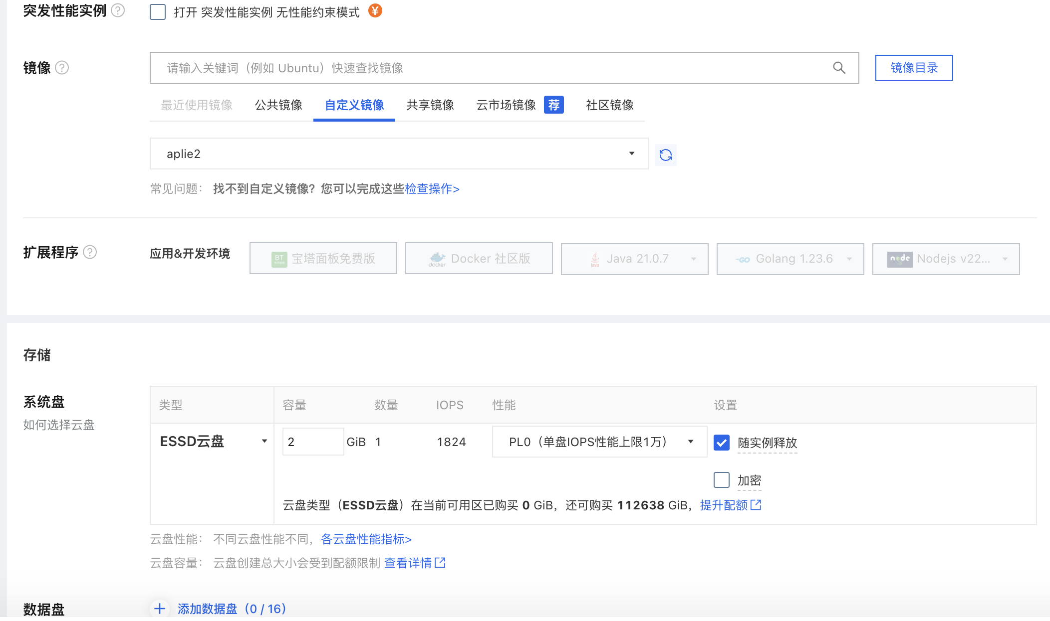 镜像(自定义镜像 点击自己上传的)--系统盘(类型essd云盘 -容量2g)