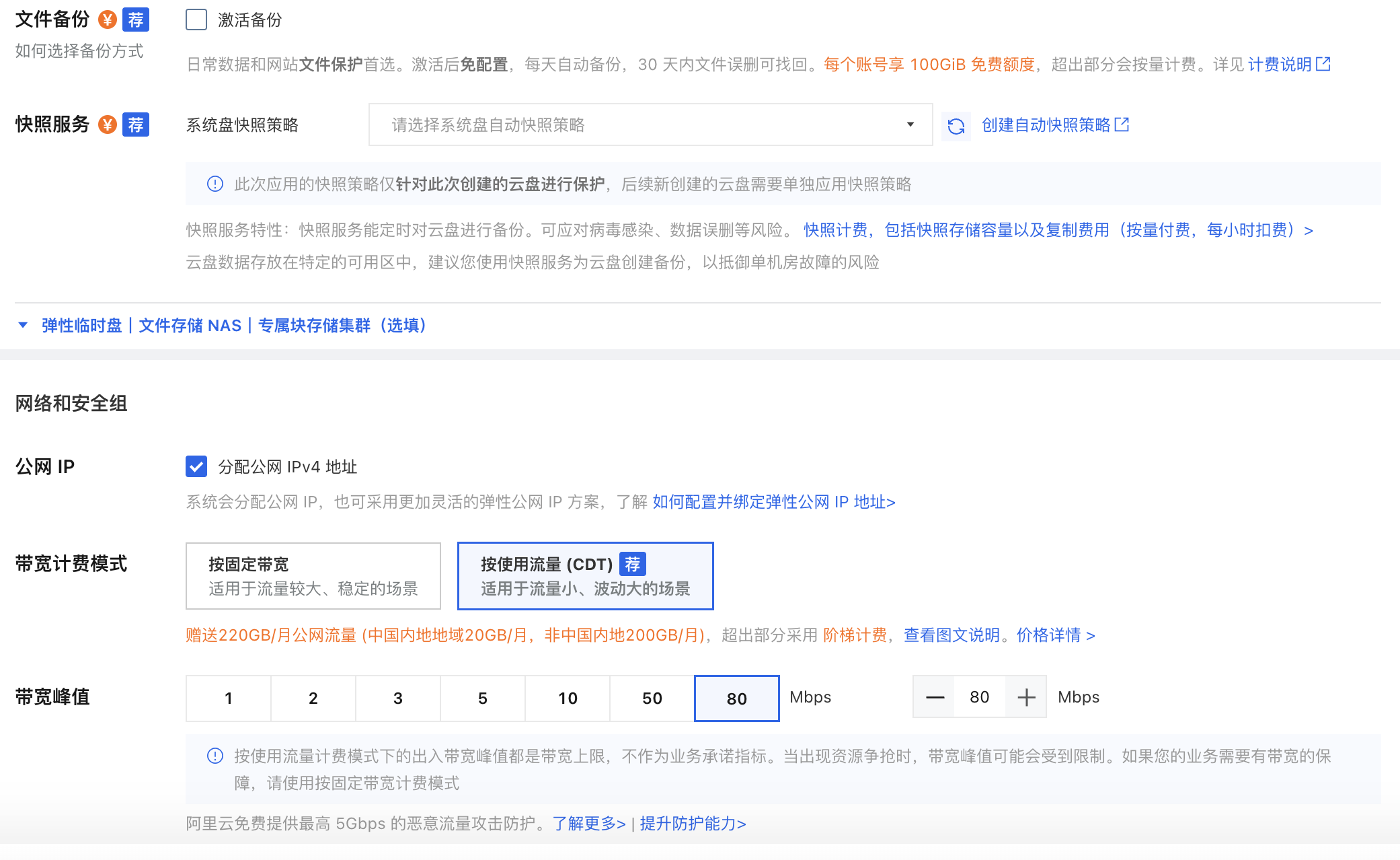 文件备份和快照服务取消勾选-勾选按流量cdt-带宽根据需求填写-最后选择5年付款可以看到最终价格